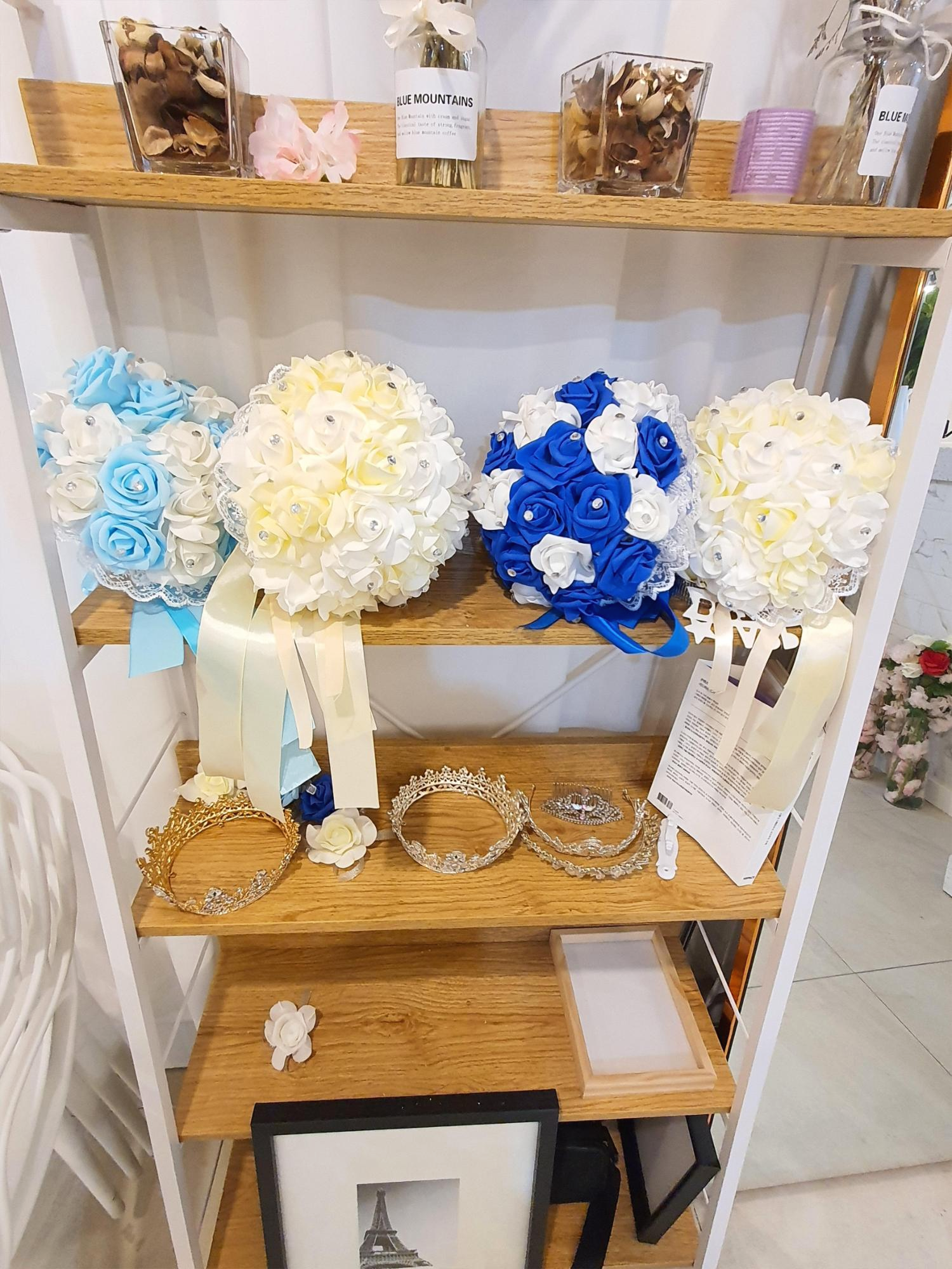 이쁜 왕관들, 그리고 부캐, 꽃 등이 전시되어 있어요.