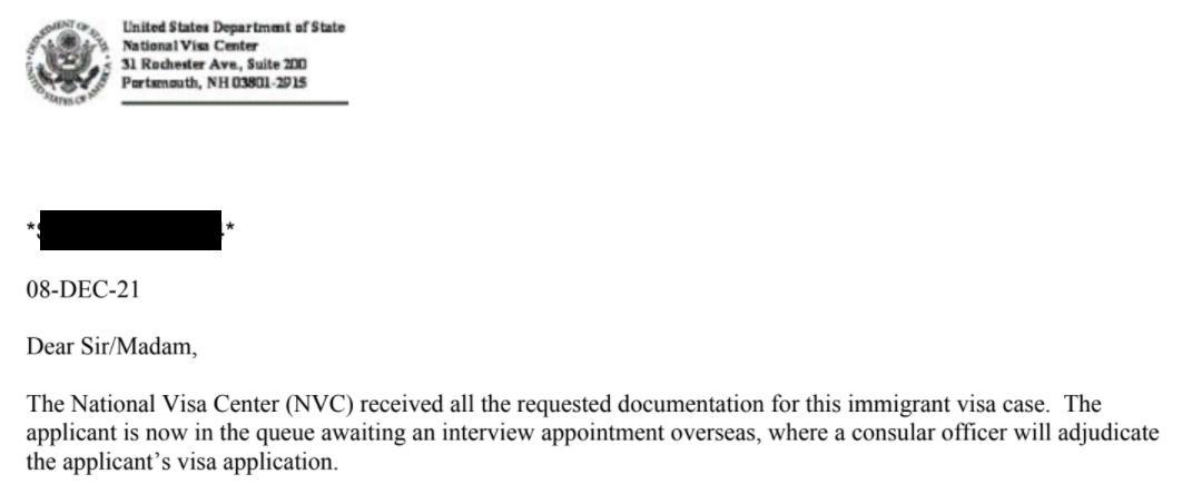 9. DS-260 리뷰완료 통보서 수령(DS-260 리뷰가 완료되어 인터뷰 대기 명단에 들어갔다는 통보서)
