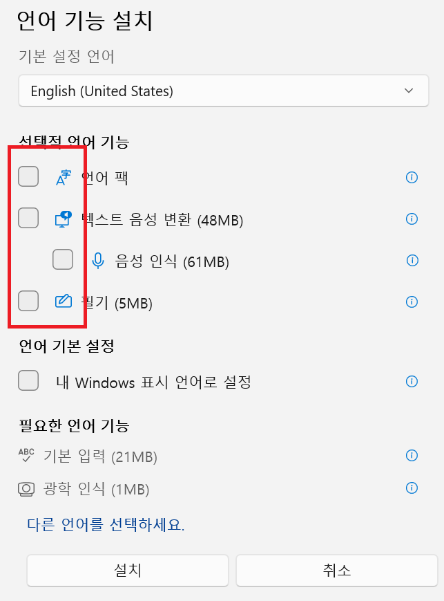 4. 모든 체크박스를 해제하고, 언어를 설치한다.