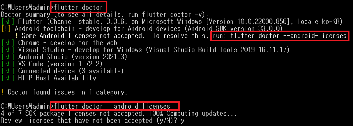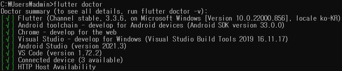 5. flutter doctor 를 활용하여 설치상태 진단도구로 최종 확인