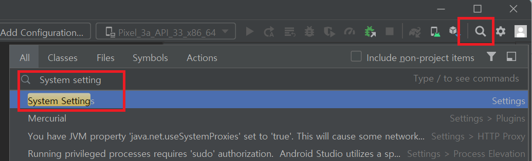 Android studio에서 system settings를 검색한다.