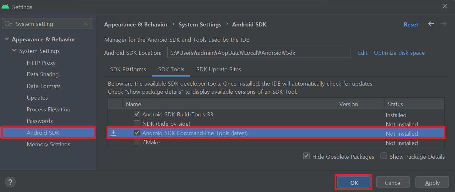 Android SDK -> SDK Tools -> Android SDK Command-line Tools (latest) 체크 후 OK