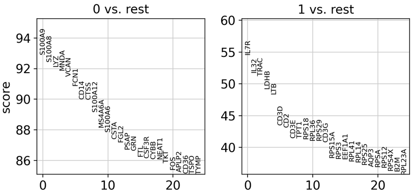 rank_genes_groups function은 cluste와 나머지에 그룹에 대한 Differential Expressed Gene (DEG) 분석을 해줌으로써, 각 cluster에 특이적 발현 유전자를 꼽아줍니다.