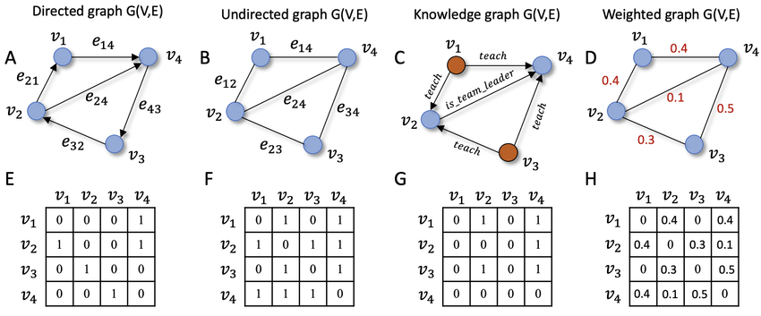 Adjacency matrix는 각 Node간의 Relationship에 관한 데이터를 담을 수 있다.