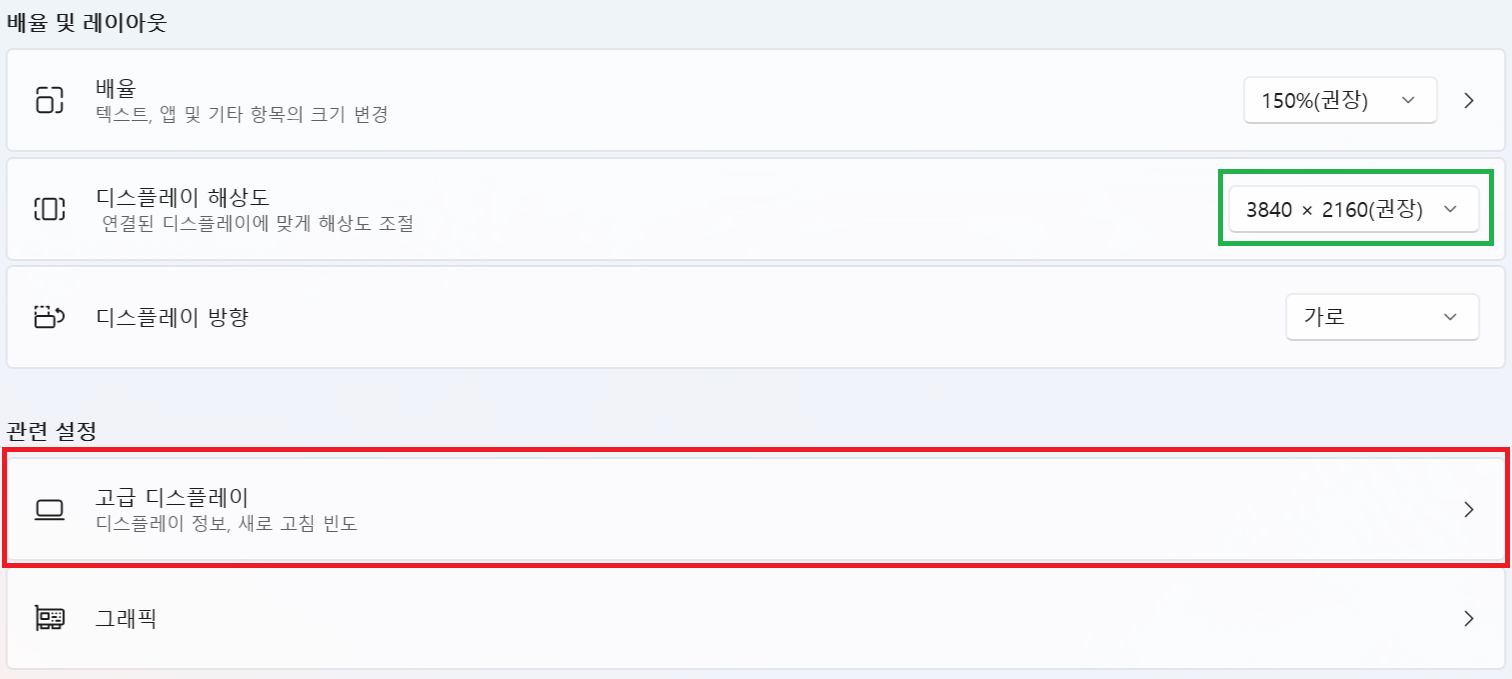 크고 해상도가 높은 모니터를 노트북에 연결하셨을 경우 최대 주사율이 낮게 설정될 수 있습니다.