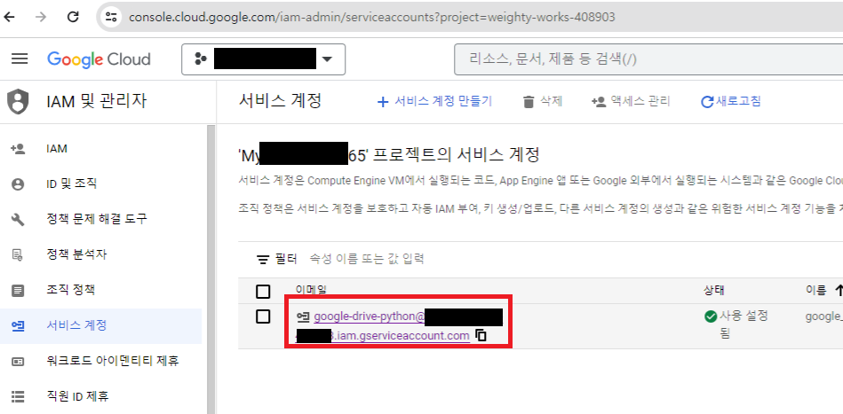 서비스 계정 탭에 들어간 후, '서비스 계정 만들기' 버튼을 클릭합니다.