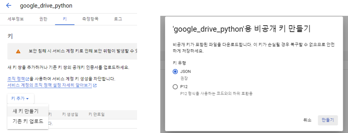 7) 서비스 계정의 키 생성하기