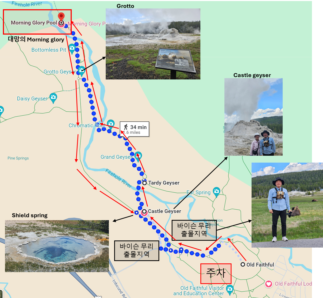 Morning glory를 보기 위해, Old faithful inn에 주차를 하시고, 겸사겸사 old faithful와 castle geyser를 감상합니다. Old faithful과 Castle geyser는 eruption (분출) 시간이 정해져있어서, 미리 꼭 시간을 확인하고 가셔야 합니다. Morning glory까지의 트래킹 코스는 대략 30분 쯤으로, 왕복 1시간 정도 소요됩니다.