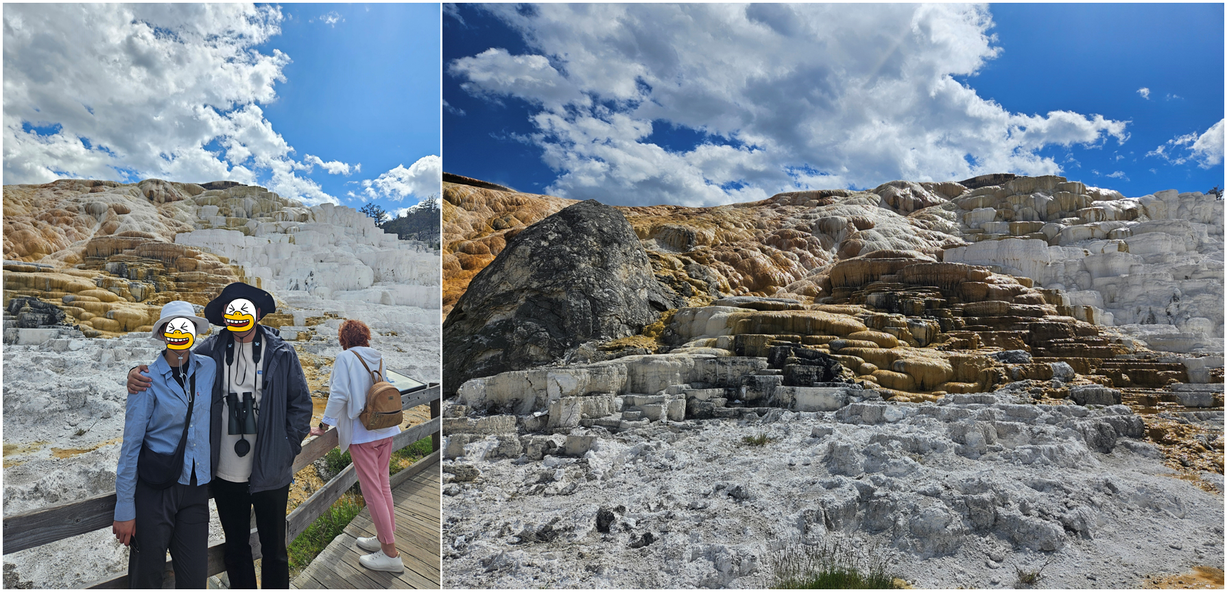자연이 만들어낸 계단식 석회화가 압도적인 경관!! 입니다. 화산활동으로 뜨거운 물이 지표면으로 올라오면서 탄산칼슘을 퇴적시켜 독특한 계단 모양의 지형을 형성한 곳입니다. 3번, 4번이 너무 말도안되게 아름다워서 그렇지, 압도적으로 신기한곳이에요. Mammoth Upper Terraces Area 코스가 따로 있는데, 여기는 필수코스는 아닌듯 해요, 아래와 비슷합니다.