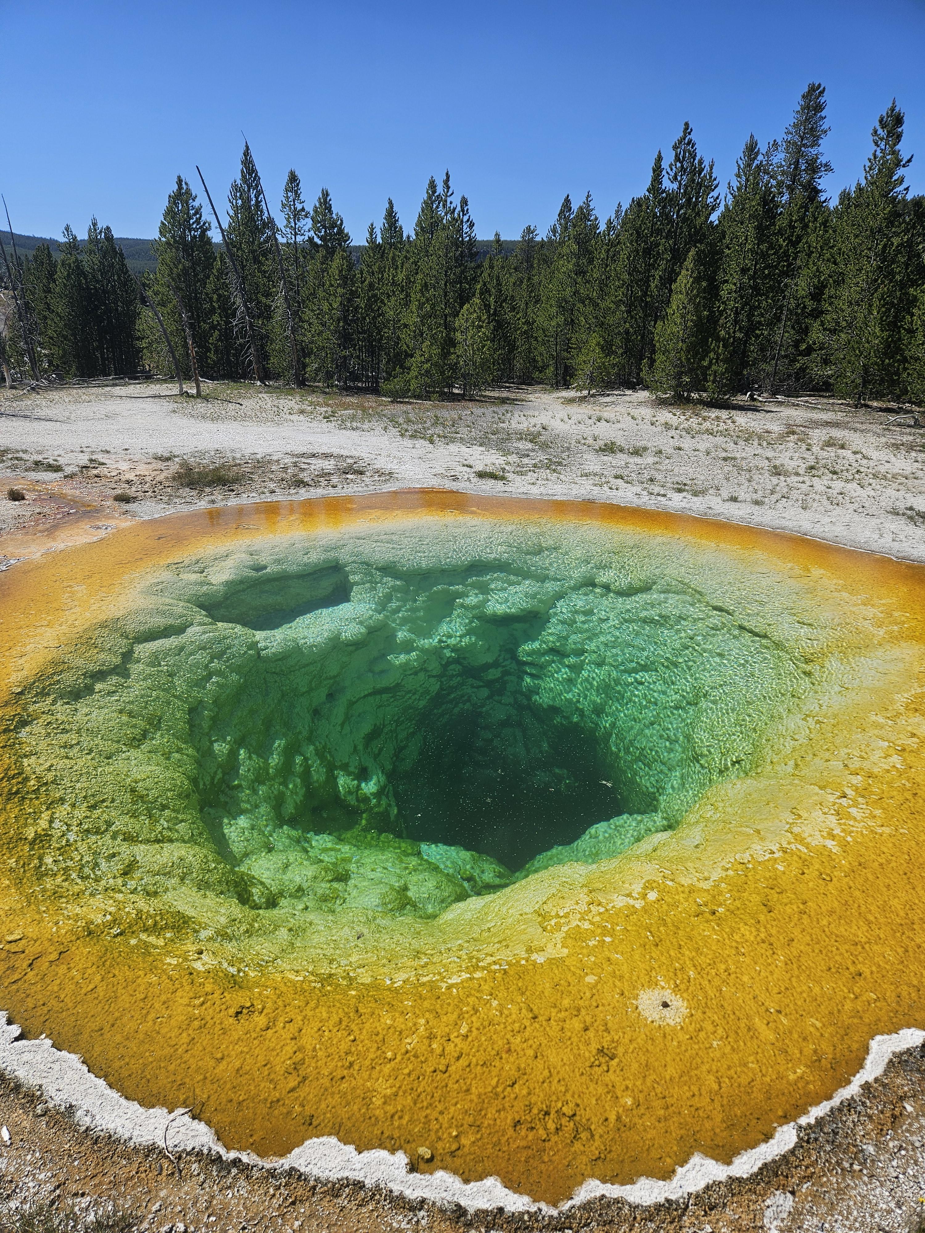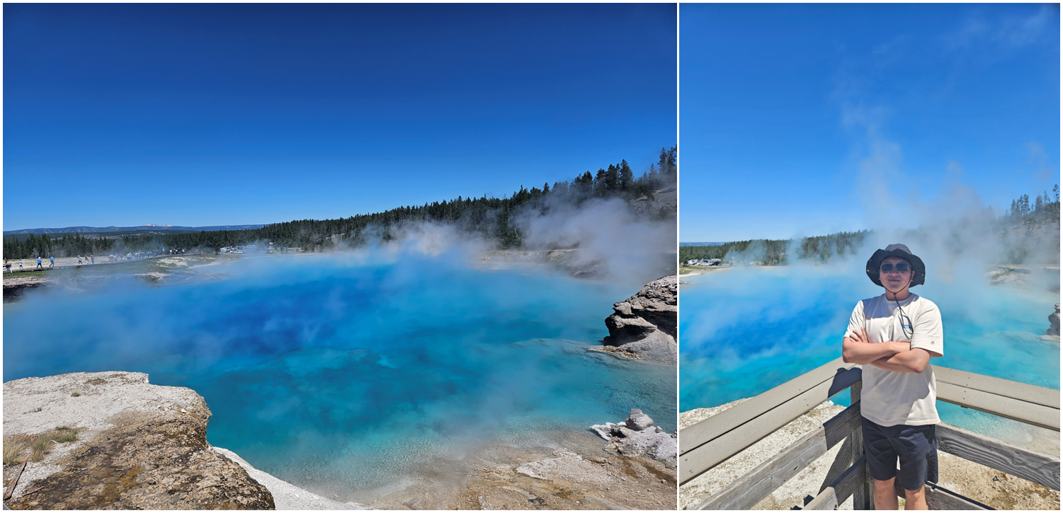 핸드폰 카메라로는 거의 담지못하는 엄청난 관경 ㅠㅠ. 꼭 직접 눈으로 보셔야합니다. 올라오는 연기를 잘 보면 흰색, 시퍼런색, 빨간색 등 매우 다양해요. 눈앞에서 보는 Grand Prismatic Spring은 너무 커서 눈에 사실 담기가 쉽지 않은데, 위쪽 언덕에 보이는 Grand Prismatic Spring Overlook으로 가시면 위에서 아래로 내려다보실 수 있습니다. 개인적으로 Morning glory와 함께 Yellowstone의 2대 패왕 입니다. 꼭 필수방문코스!