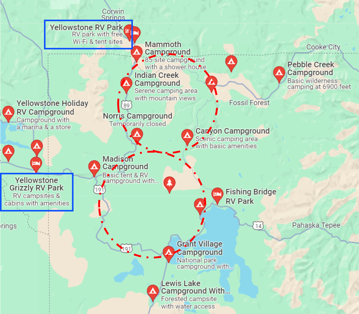 옐로스톤 바로옆에 붙어있는 캠핑장 예약은 거의 1년 전에 마감되는 경우가 많아요, 최대한 빨리 하시면 좋습니다. 옐로스톤은 숫자 8과 비슷한 형태로 되어있어서, 동선을 고려해서 여행 루트를 잘 짜셔야합니다.