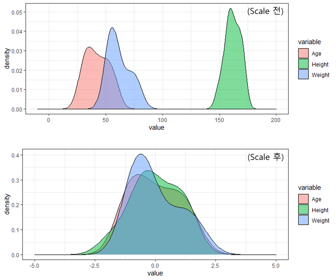 (Scale 전과 후의 데이터의 분포)