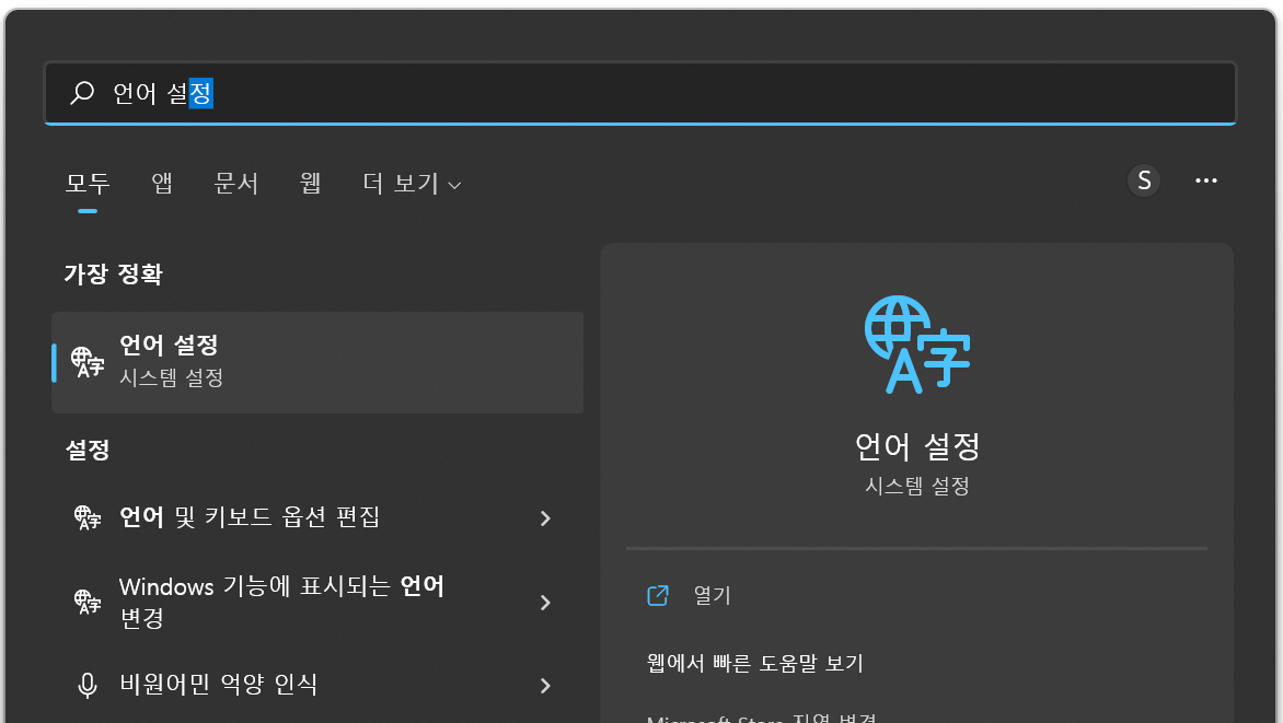 1. 시작키를 누른 후, "언어 설정" 을 검색, 그리고 실행한다.