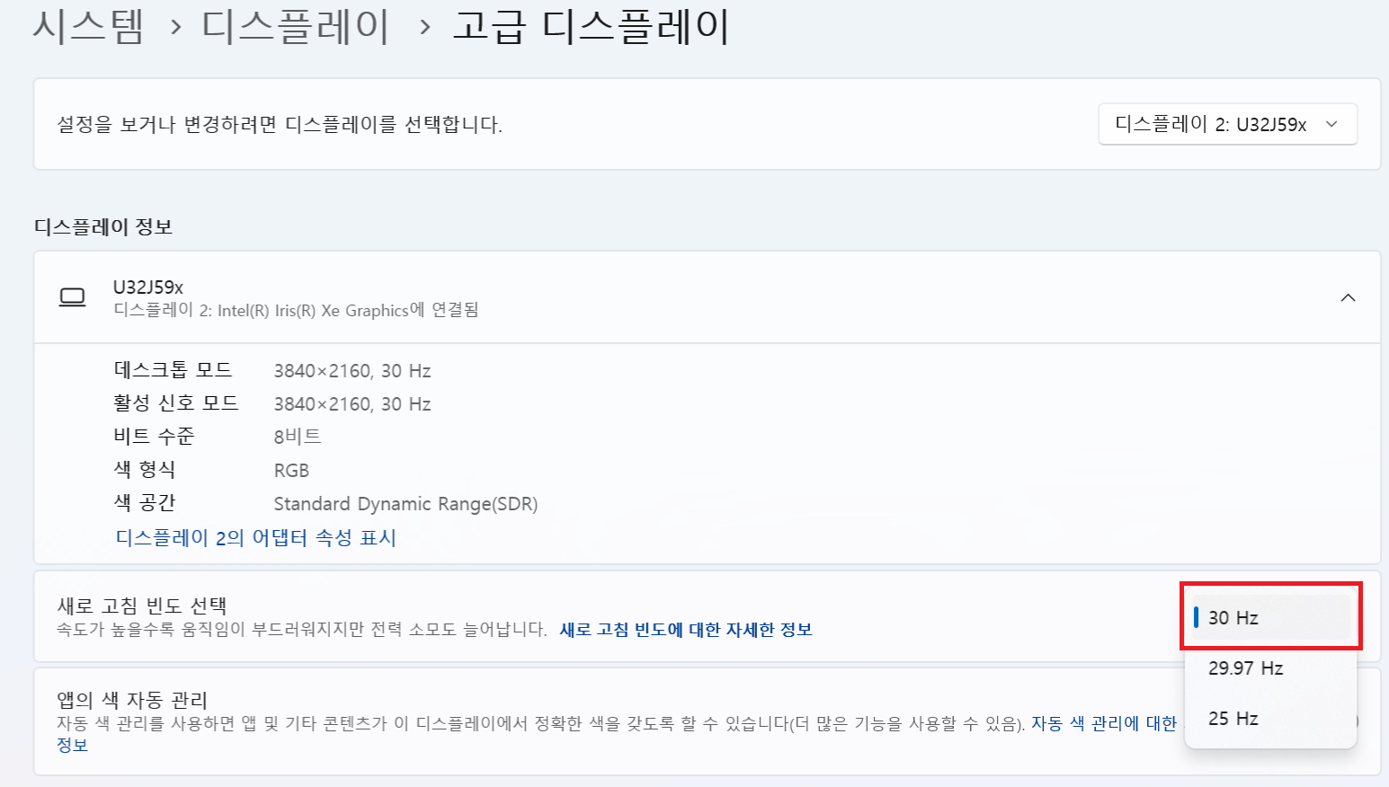 아래 그림과 같이 '새로 고침 빈도 선택' 즉, 주사율이 30Hz 정도로 낮게 설정되어있을 것입니다.
