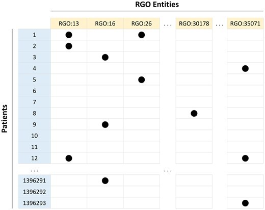 각 점은 RGO entity가 radiology reports에 존재함을 의미함.