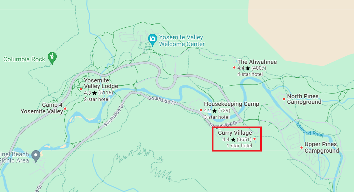 아래 그림의 Curry Village 빨간 네모박스 근처를 기준으로 잡으시면 가장 좋습니다.